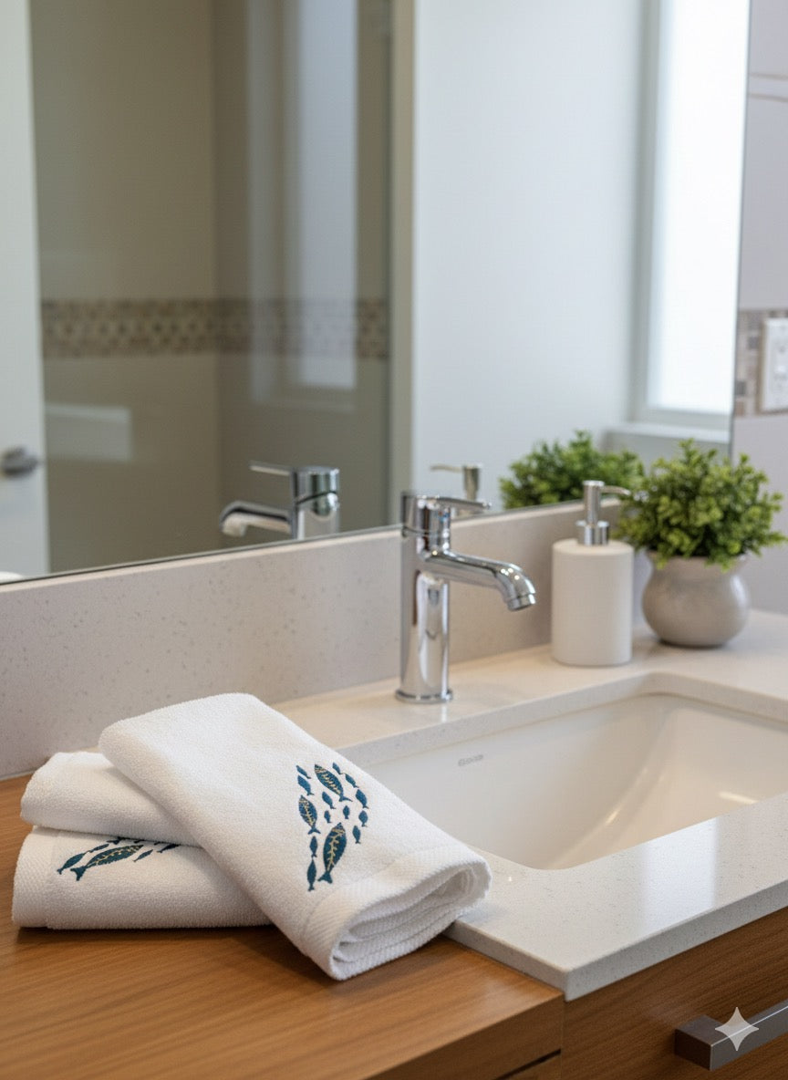 This elegant set of two 30x50 white guest towels features beautifully detailed embroidery in shades of blue and turquoise, adding a fresh coastal touch to any space. Crafted from soft, premium cotton, each towel combines delicate design with everyday practicality—perfect for elevating your bathroom, guest area, or home décor with a subtle pop of color and charm.