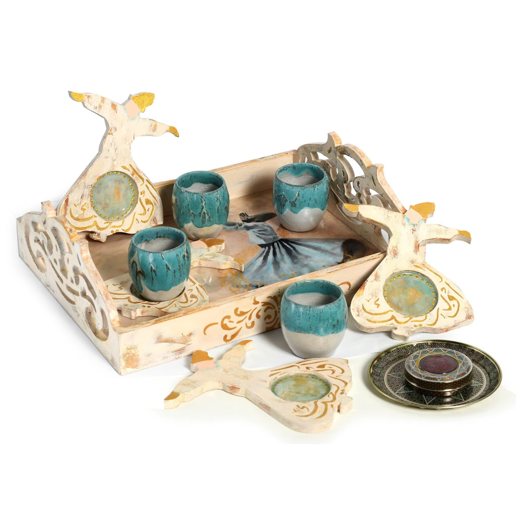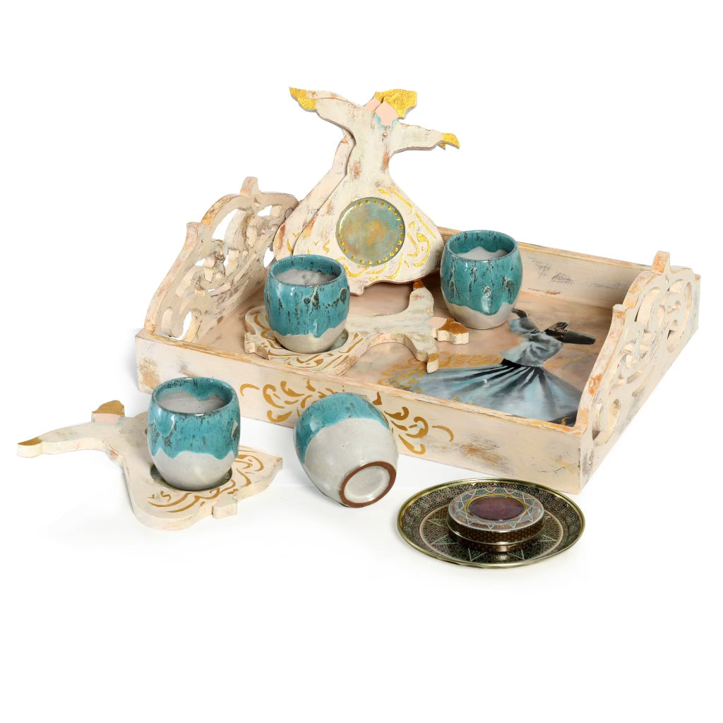 Set of lugsury tray and four coasters of darvish along with four coffee cups and saffron. All items are hand made.