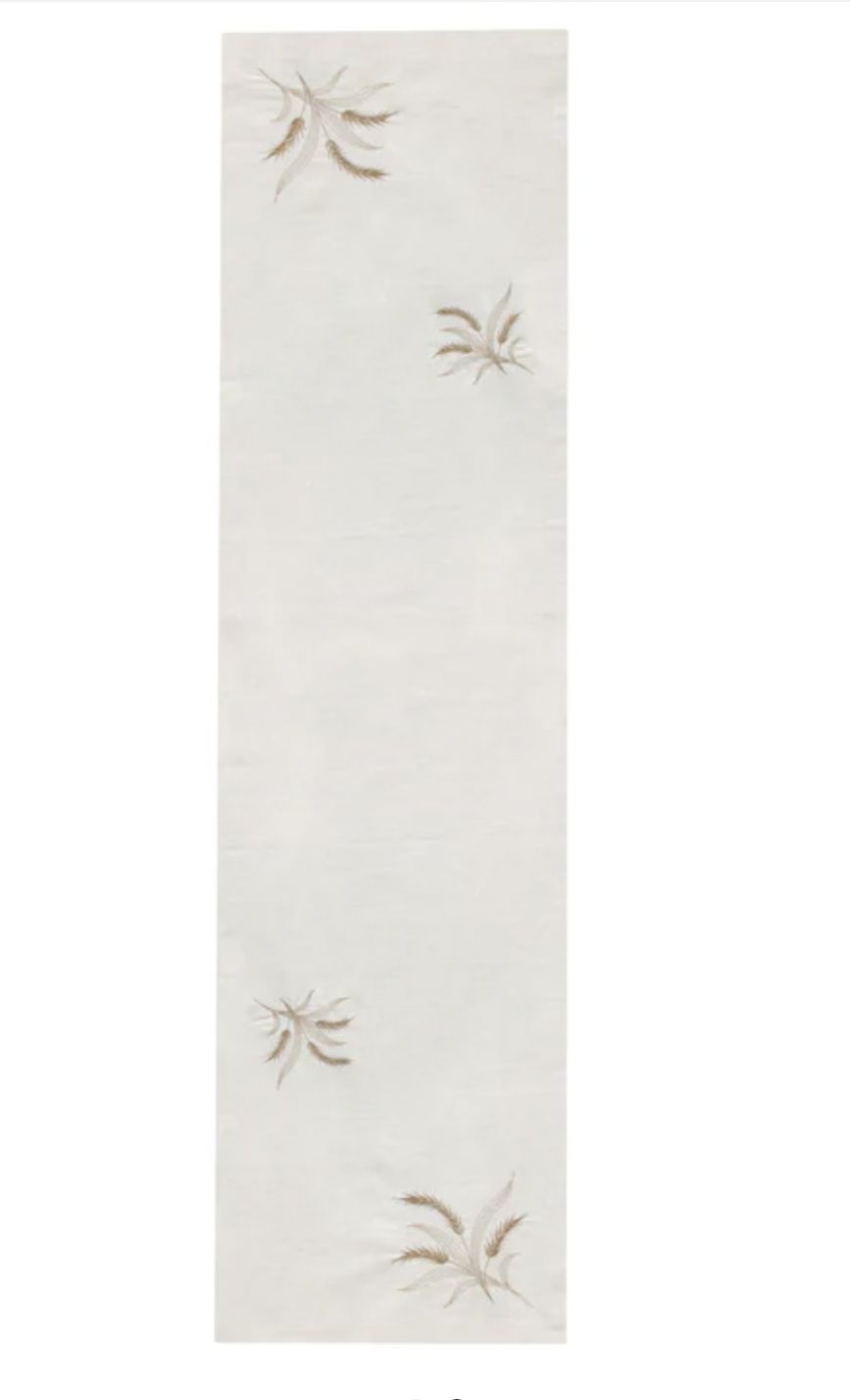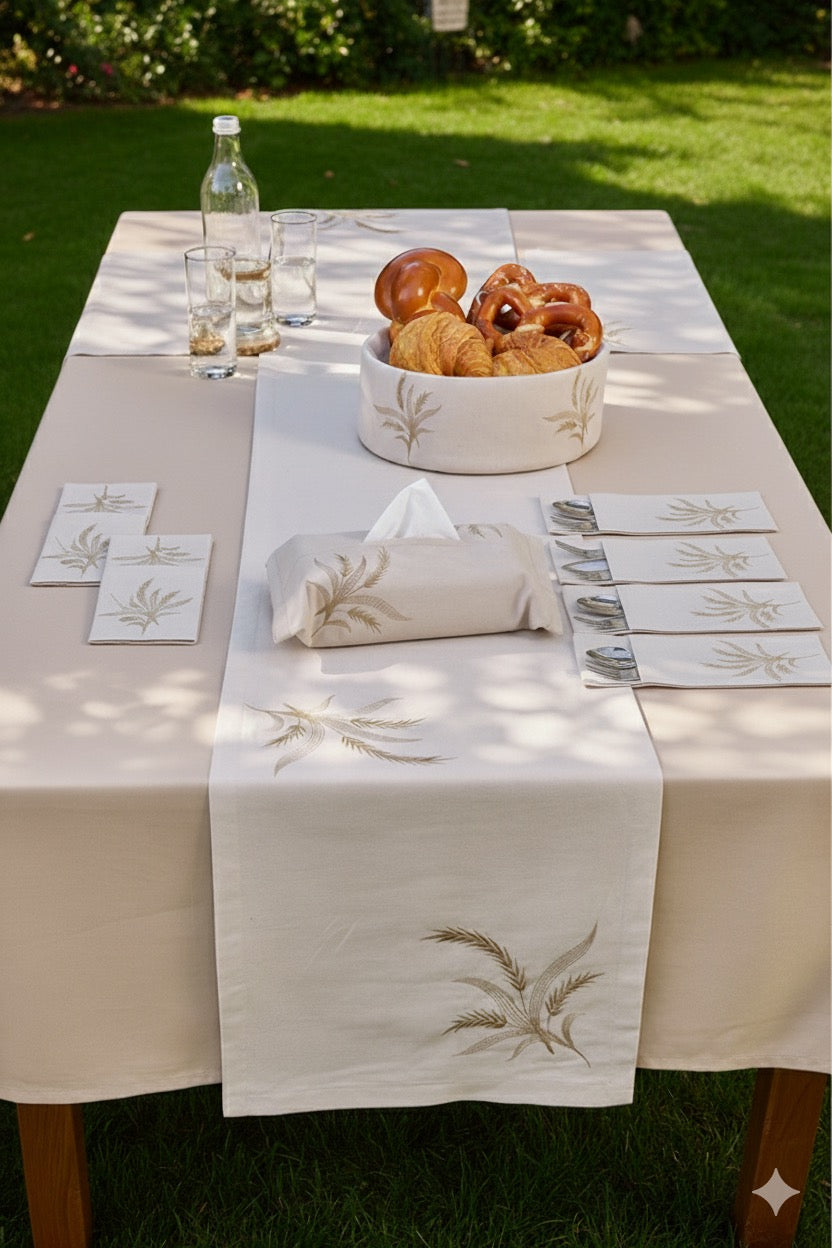 A beautifully arranged outdoor dining table set. The table is covered with an elegant beige table runner embroidered with a refined golden wheat design — a motif repeated across all the table accessories for a cohesive and sophisticated look.