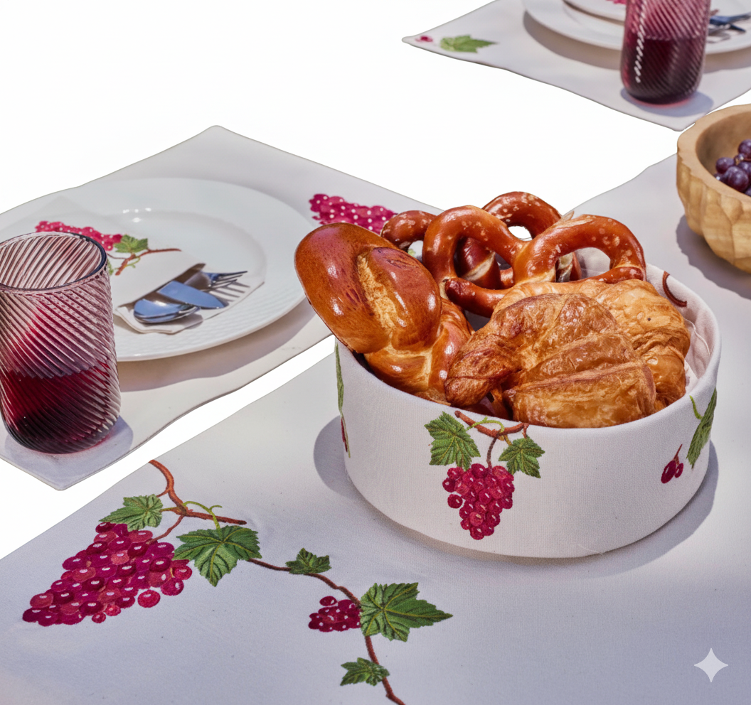 Transform your dining experience with the Grapevine’s Collection — a refined table luxury cotton set inspired by the timeless beauty of vineyard elegance. Each piece is crafted from high-quality cotton and delicately embroidered with vibrant grape clusters, adding a touch of sophistication and warmth to your table setting.