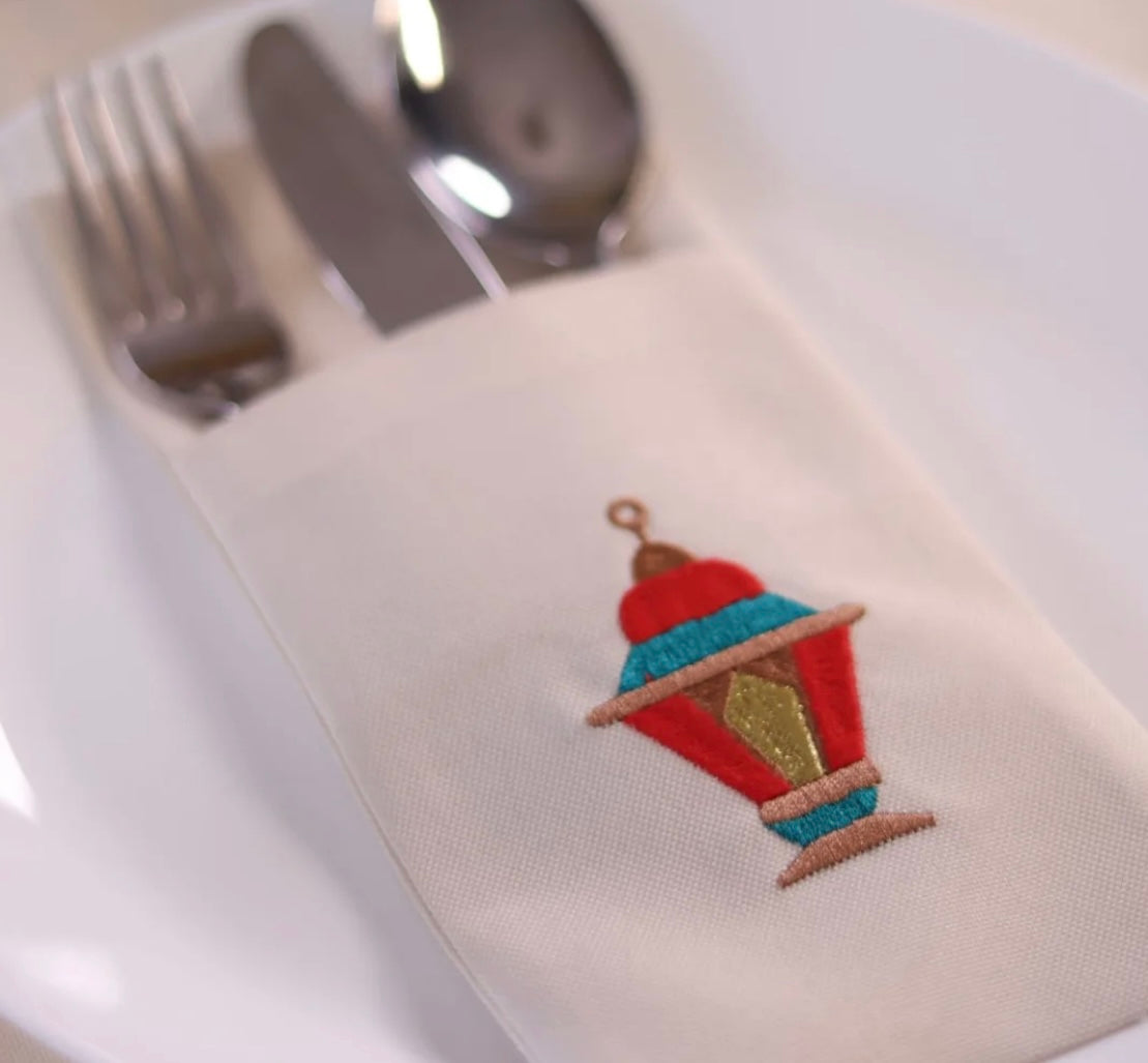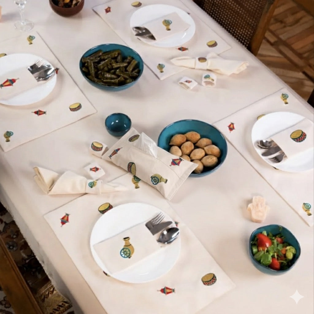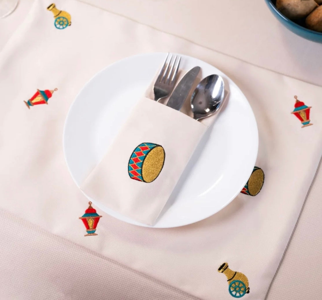 . The Placemats: Serving as the foundation of your setting, each mat is adorned with a joyful medley of classic Ramadan symbols. You'll find the intricate details of the Fanous (lanterns) casting a warm glow, and the playful energy of the Ramadan Cannon and the Mesaharati's Drum, symbolizing the start and end of the fast.