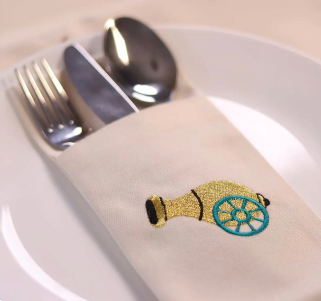 • The Tissue Cover: Placed prominently in the middle, this functional piece becomes a beautiful focal point. It features the charming, detailed embroidery of the cannon, lanterns, and drums, tying the entire setting together with a sense of unity and cheer.