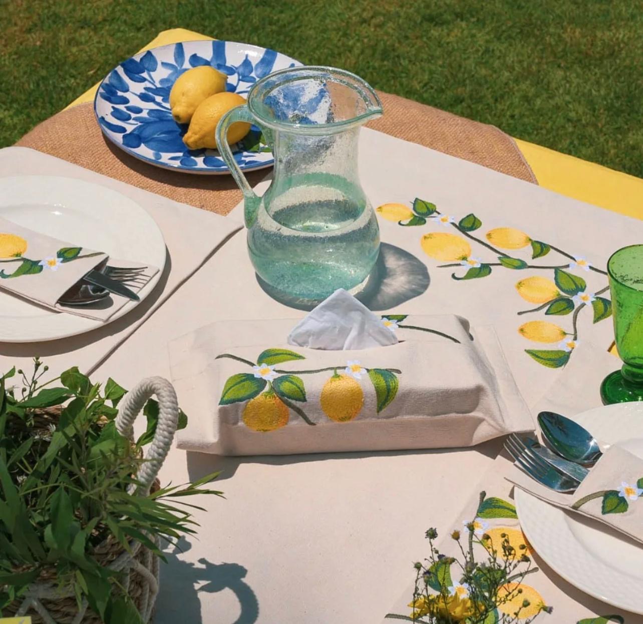 Bring the brightness of sunlit citrus groves to your dining space with the Lemon Grove Collection — a lively set that captures the zest and warmth of golden lemons. Like drops of sunshine resting on green leaves, each piece is crafted from premium cotton and adorned with embroidery lemon motifs that radiate freshness and joy.