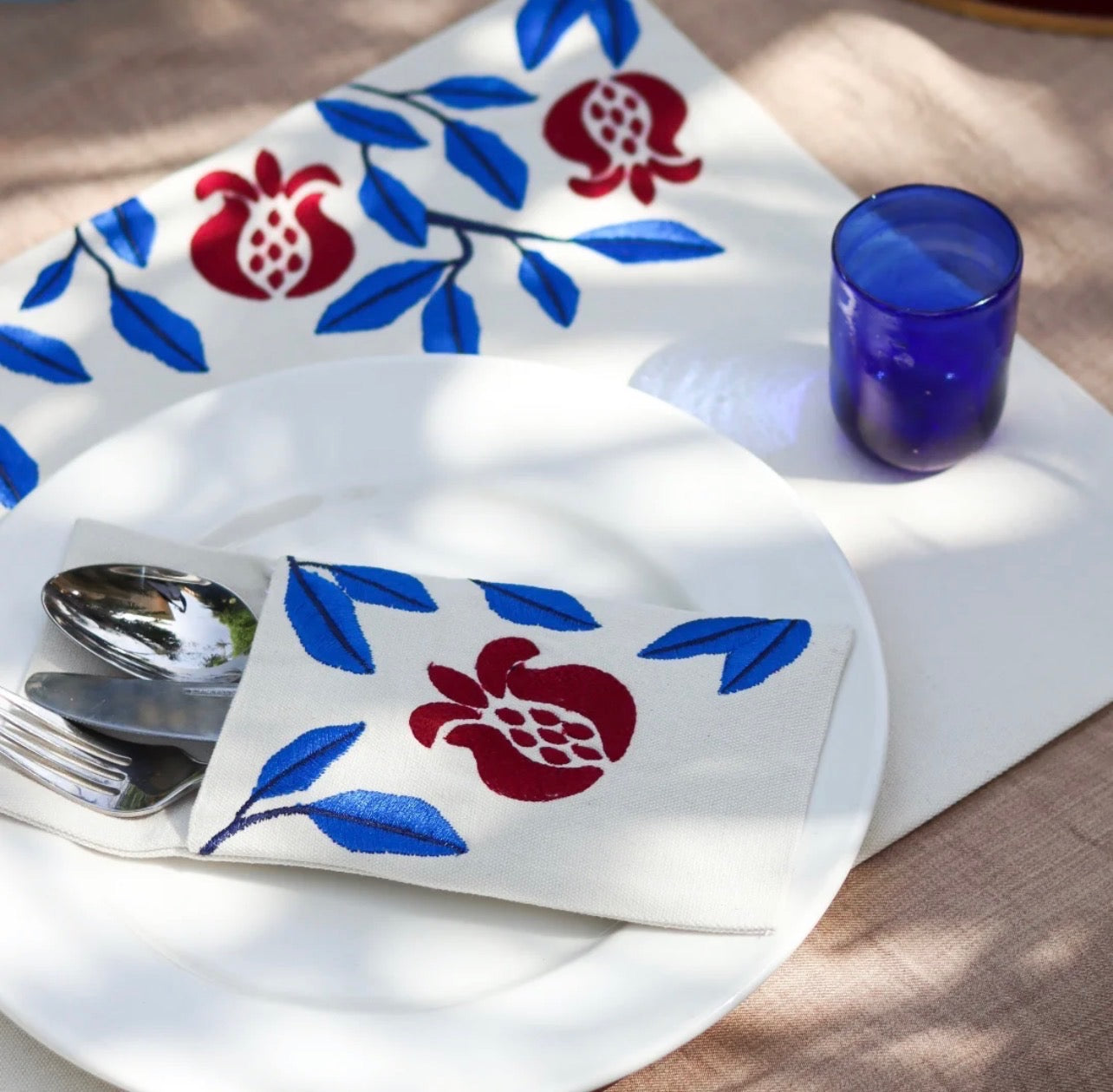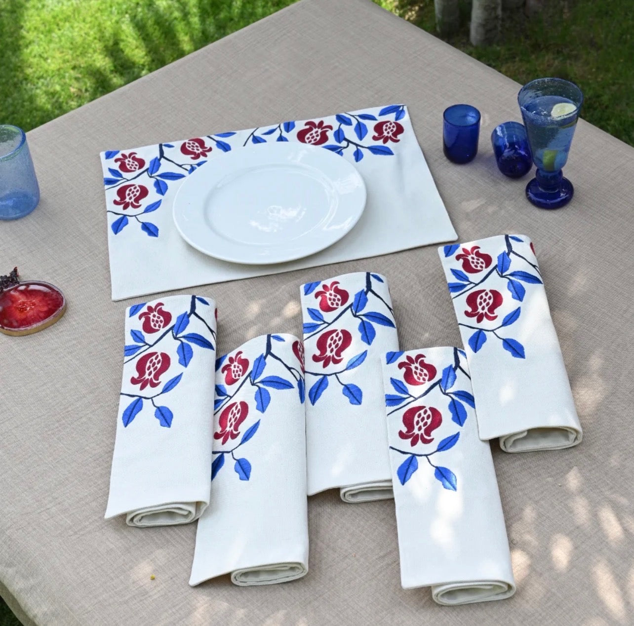 Bring the charm of Mediterranean artistry to your dining table with the Pomegranate Garden Collection — a beautiful set that combines tradition, color, and refinement. Each piece is adorned with vibrant red pomegranates and blue leaves delicately embroidered premium on soft cotton, creating a fresh and inviting atmosphere for every meal.