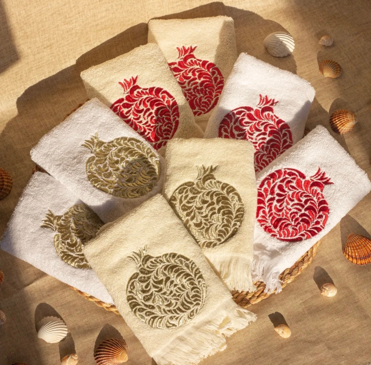 These plush 30x30 hand towels feature a striking, intricate crimson pomegranate embroidery.